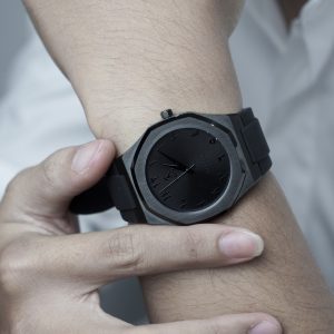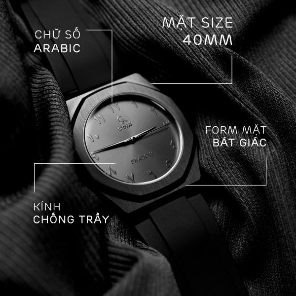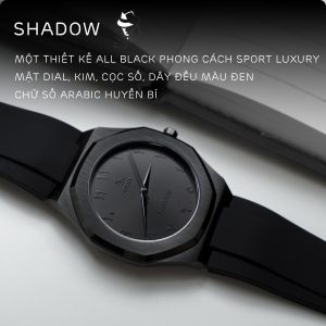 Shadow là mẫu đồng hồ bước ra từ bóng đêm, mang đến một trải nghiệm đầy khác biệt. Toàn bộ thiết kế phủ sắc đen toàn diện, từ vỏ, dây, mặt số cho đến kim và cọc số, kết hợp tinh tế giữa bề mặt bóng và phay xước, tạo nên chiều sâu mạnh mẽ và sang trọng.